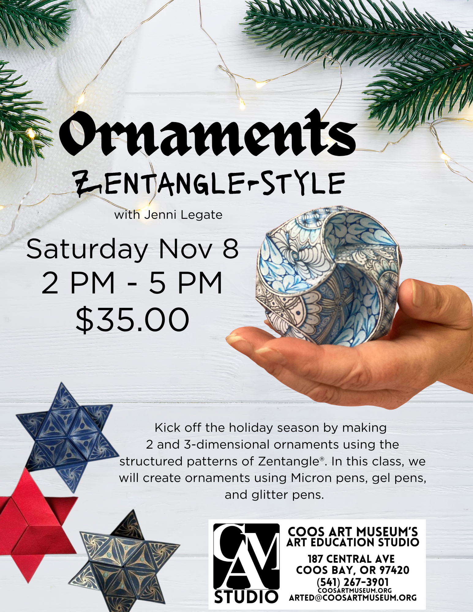 Kick off the holiday season with a relaxing and creative Zentangle® ornament-making class! Using Micron pens, gel pens, and a touch of glitter, you’ll learn how to design intricate patterns that turn simple ornaments into miniature works of art. With provided templates and easy-to-follow guidance, you’ll be inspired to create several unique pieces that capture the magic of the winter season.